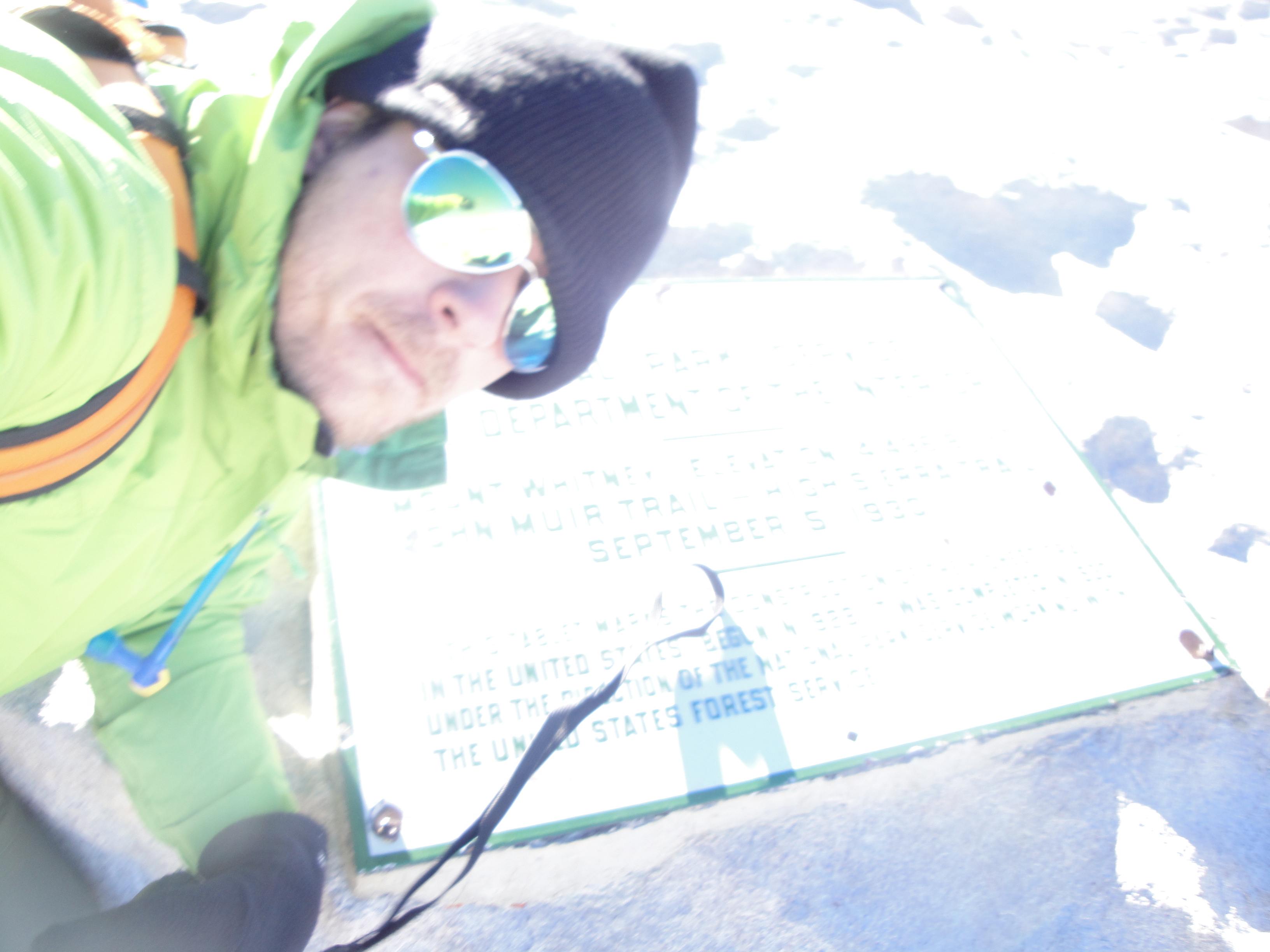 The summit of Mt. Whitney (14,505'), the highest peak in the lower 48. Check out the strap - the winds were 70 mph that morning.